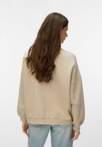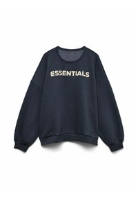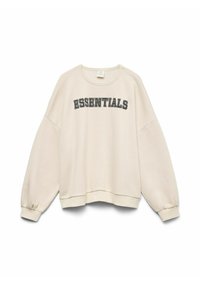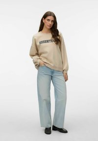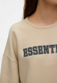 Femme aux longs cheveux bruns portant un sweat-shirt beige avec le texte « ESSENTIALS » et un jean bleu clair, debout devant un fond blanc uni.