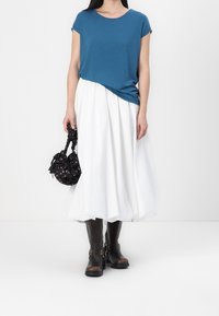 Femme portant un t-shirt bleu à manches courtes et une jupe blanche, debout devant un fond clair uni.