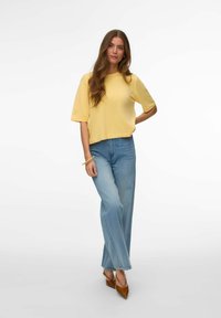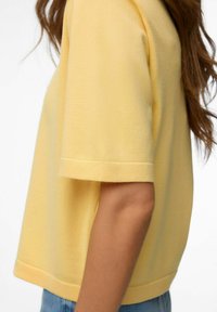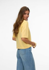 Jeune femme aux longs cheveux bruns portant un haut jaune à manches courtes et un jean bleu, posant avec les mains derrière la tête.