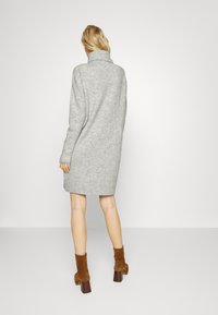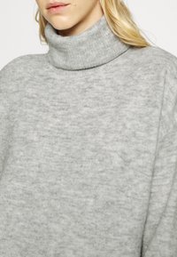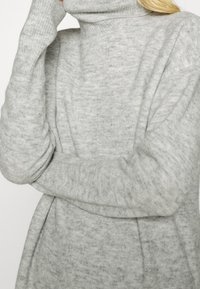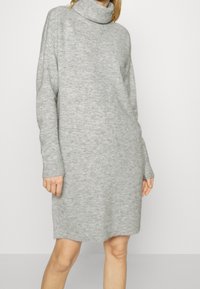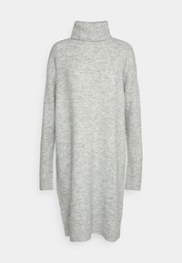Robe-pull grise avec un col roulé haut, des manches longues et des poignets côtelés. Texture douce avec une coupe décontractée, se terminant au-dessus des genoux.