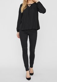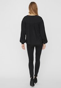 Femme portant un chemisier noir ample à manches longues bouffantes avec un détail de lien au niveau du col, associé à un pantalon noir ajusté.
