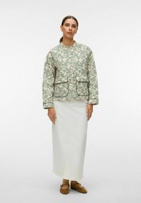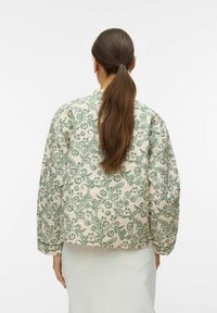 Femme portant une veste matelassée crème avec imprimé floral vert, boutons-pression, deux poches avant à rabat et col montant.