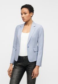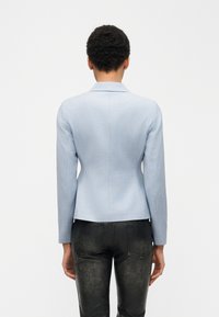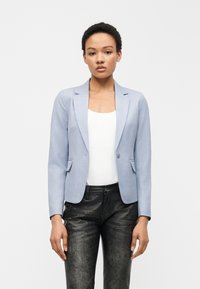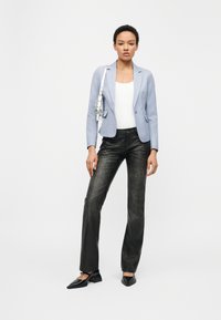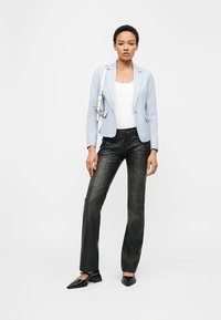 Femme aux cheveux courts et bouclés portant un blazer bleu clair, un haut blanc côtelé et un pantalon noir texturé, debout devant un fond blanc uni.