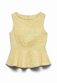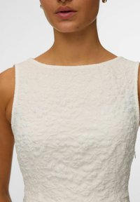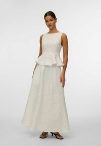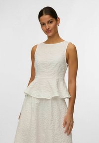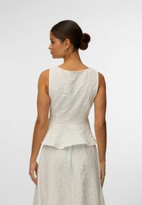 Femme aux cheveux foncés portant un haut péplum blanc texturé sans manches et une jupe assortie, sur un fond clair uni.