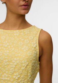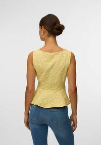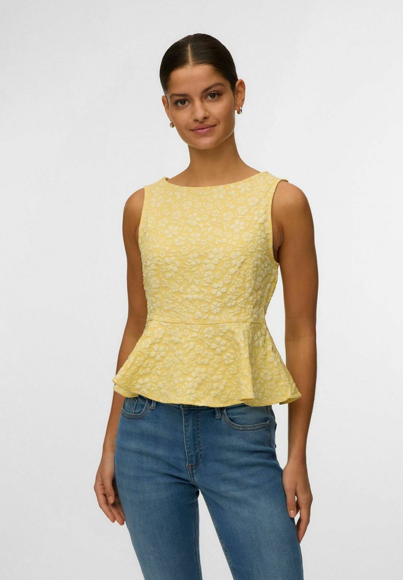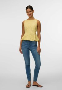 Femme portant un haut à basque sans manches jaune à fleurs, associé à un jean bleu, debout devant un fond clair uni.