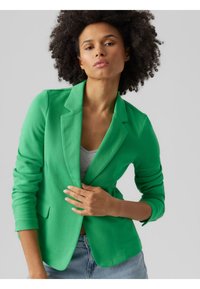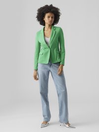 Femme aux cheveux bouclés portant un blazer vert vif, un haut gris clair et un jean bleu clair, debout devant un fond uni gris clair.