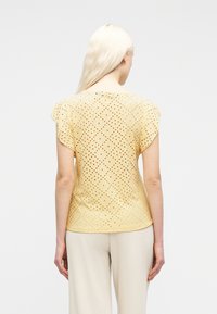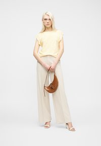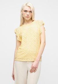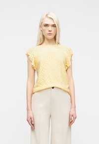 Femme blonde portant un chemisier jaune à manches courtes œillet avec manches à volants et un pantalon beige taille haute, debout devant un fond blanc.