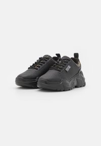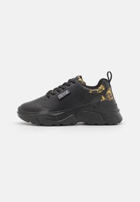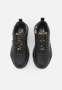 Baskets noires avec un design perforé, semelle épaisse et accents floraux jaunes. Dotées de lacets, d'un col rembourré et d'un logo sur la languette.