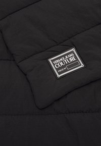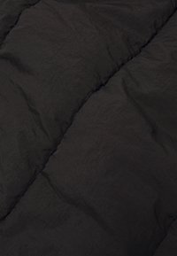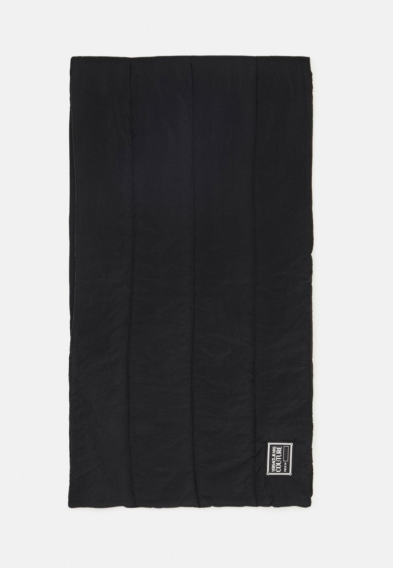 Écharpe noire rectangulaire matelassée avec des surpiqûres verticales et une étiquette de marque blanche cousue dans le coin inférieur droit.