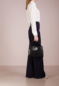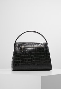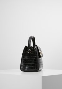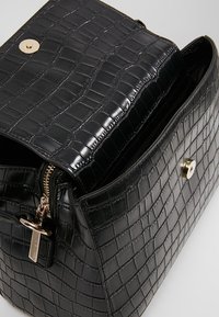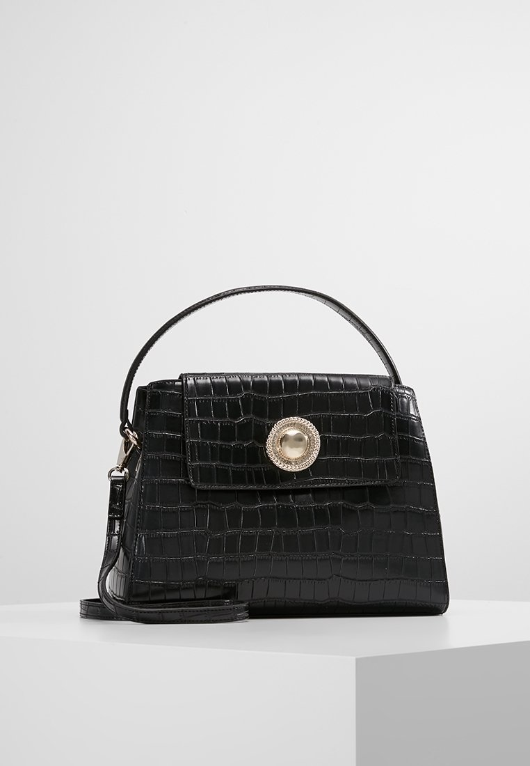 Sac à main en simili cuir noir avec texture crocodile, poigné supérieure, bandoulière amovible et détail en fermoir circulaire en ton doré.