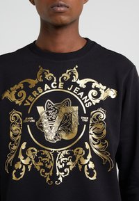 Sweat-shirt noir à manches longues avec un imprimé doré orné représentant une tête de tigre et le texte « Versace Jeans », porté par une personne debout.