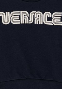 Sweatshirt à manches longues bleu marine avec le logo Versace crème sur la poitrine et deux boutons dorés sur l'épaule gauche.