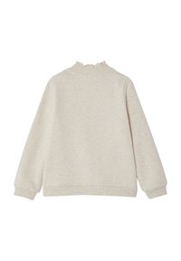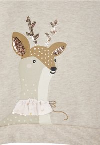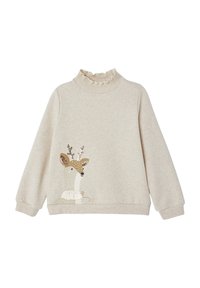Pull beige à manches longues pour tout-petit avec col montant à volants et un motif de renne souriant avec des bois en sequins sur le devant.