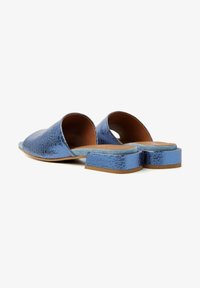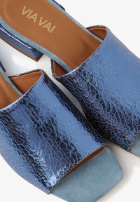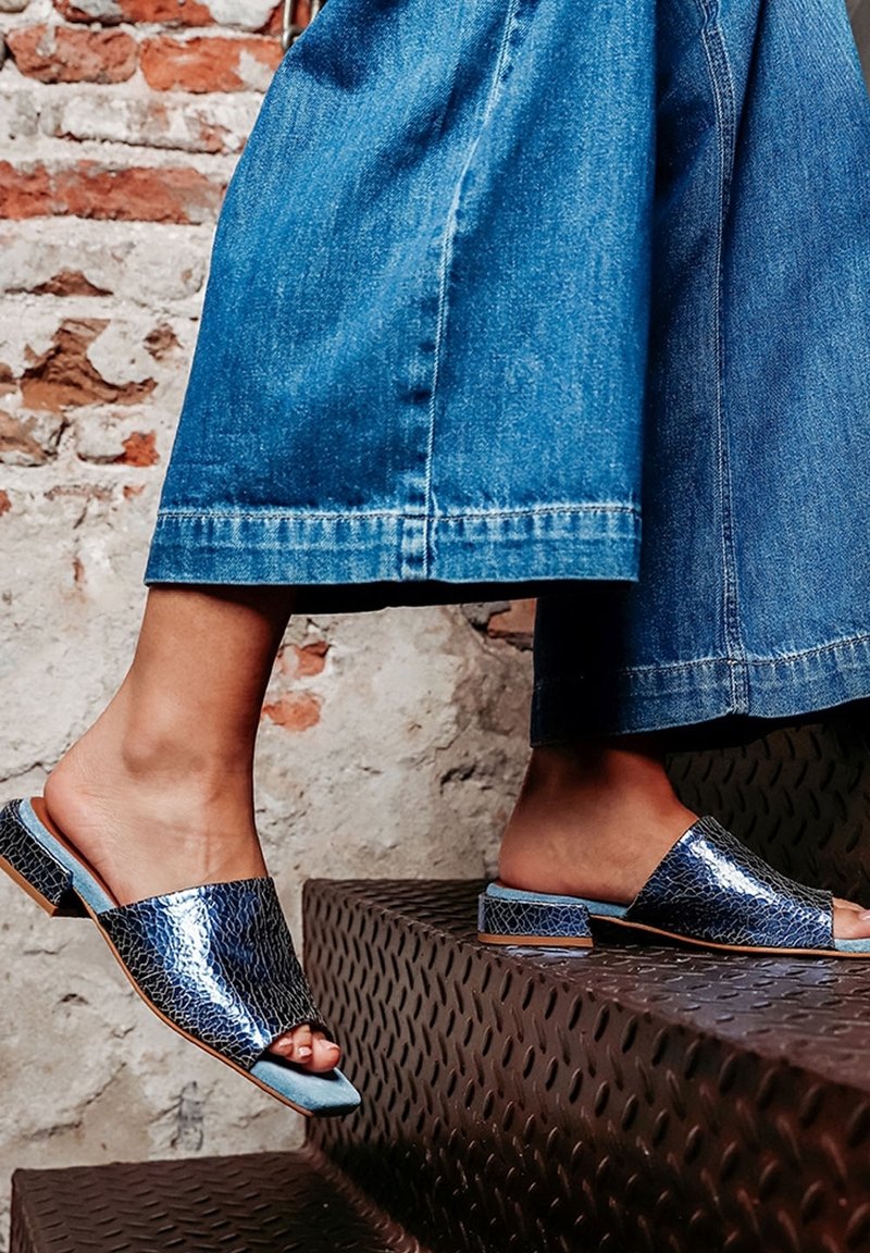 Chaussures glissantes métalliques bleues à bout ouvert, présentant un dessus texturé et un talon plat, portées avec un pantalon en denim à jambes larges sur des marches.