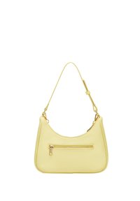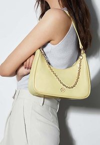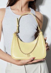 Femme portant un débardeur gris clair tient un sac à main jaune pâle avec une chaîne en or comme détail et un petit logo rond sur le devant.