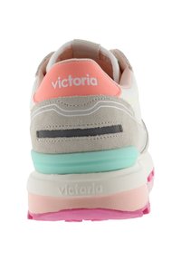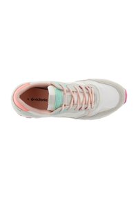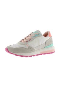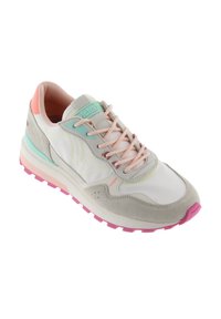 Baskets basses en daim gris clair et tissu blanc, avec des accents rose et menthe, des lacets roses et une semelle extérieure rose, sur fond blanc.