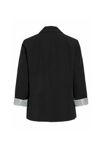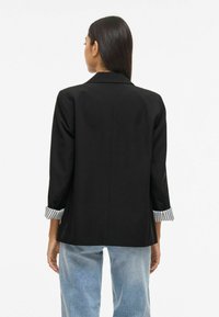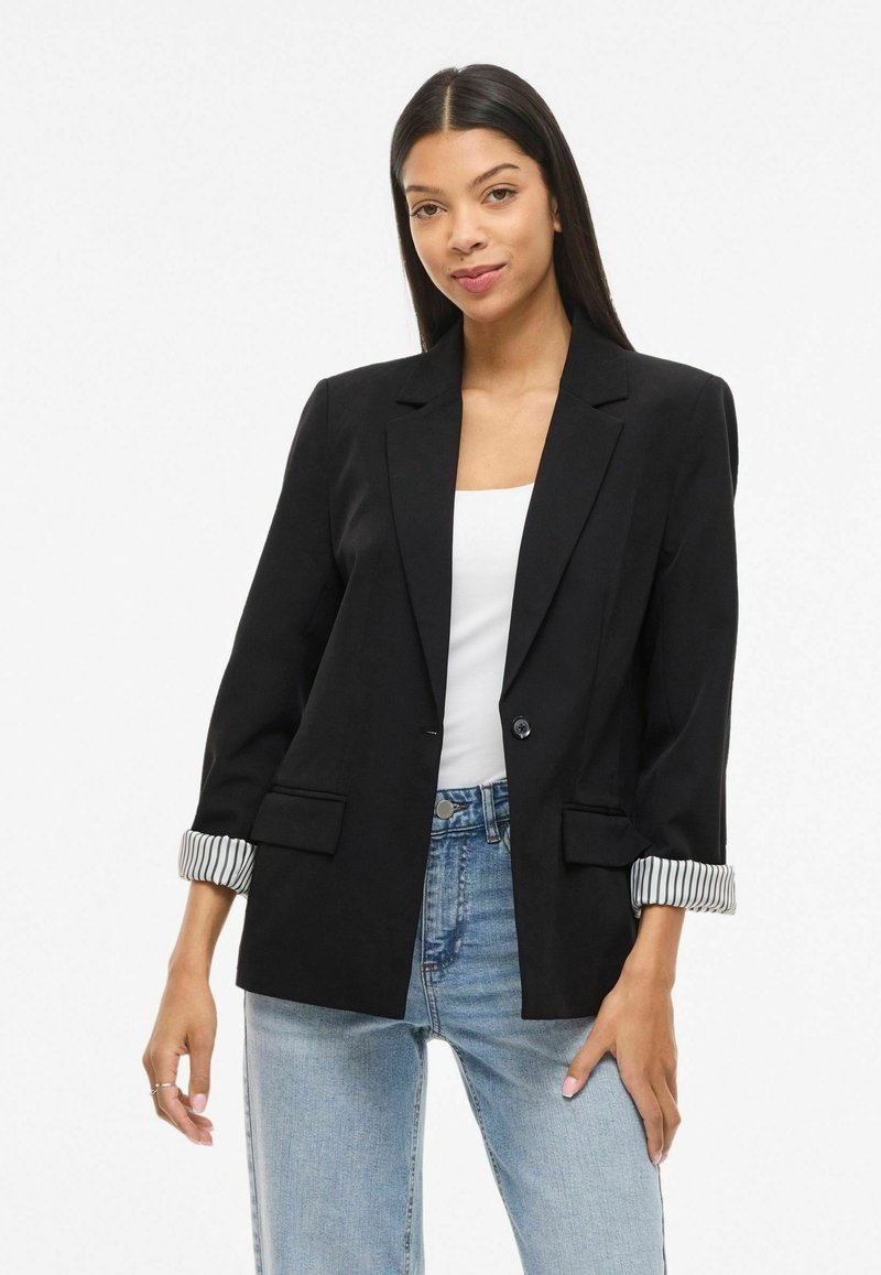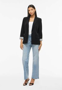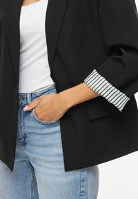 Femme portant un blazer noir avec des poignets rayés retroussés, un haut blanc et un jean bleu clair, debout devant un fond blanc uni.