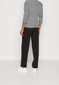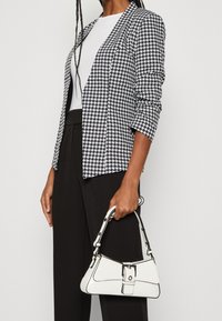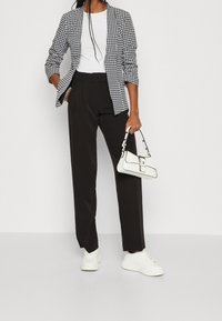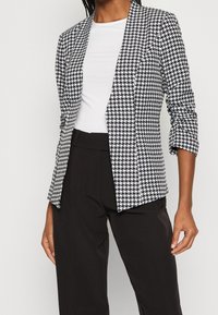 Blazer pied-de-poule noir et blanc porté sur une chemise blanche, assorti à un pantalon noir taille haute, porté par une personne debout.