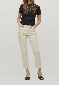 Femme portant un top noir en dentelle à manches courtes avec un pantalon beige taille haute, mains dans les poches, sur un fond clair uni.