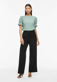 Femme aux longs cheveux foncés portant un chemisier vert sauge texturé à manches bouffantes et un pantalon noir ajusté, debout avec une main dans la poche.