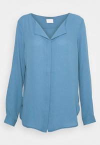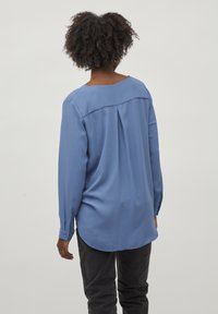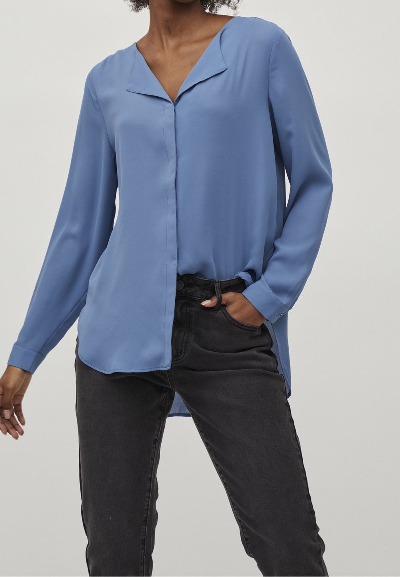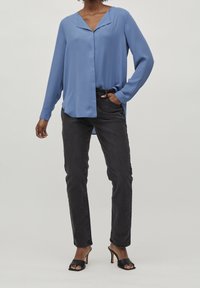 Femme portant un chemisier bleu à manches longues avec un col et un jean noir, une main dans la poche, sur un fond clair uni.