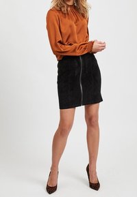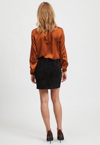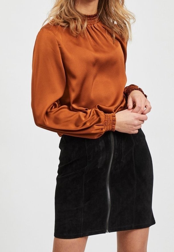 Femme portant un chemisier à manches longues couleur rouille avec des poignets froncés et une jupe en daim noir avec une fermeture éclair frontale.