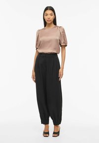 Femme aux longs cheveux noirs portant un chemisier beige brillant à manches bouffantes rentré dans un pantalon noir plissé taille haute, debout et souriante.