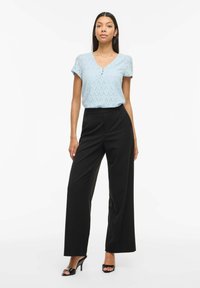 Femme aux longs cheveux noirs portant un chemisier bleu clair à manches courtes avec motif ajouré et un pantalon taille haute noir sur fond blanc.