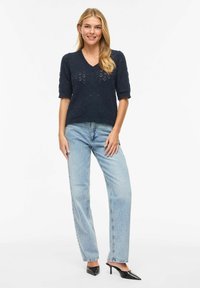 Femme blonde portant un pull en maille bleu marine à manches courtes avec un motif en losange et un jean taille haute bleu clair, debout face à l'avant.