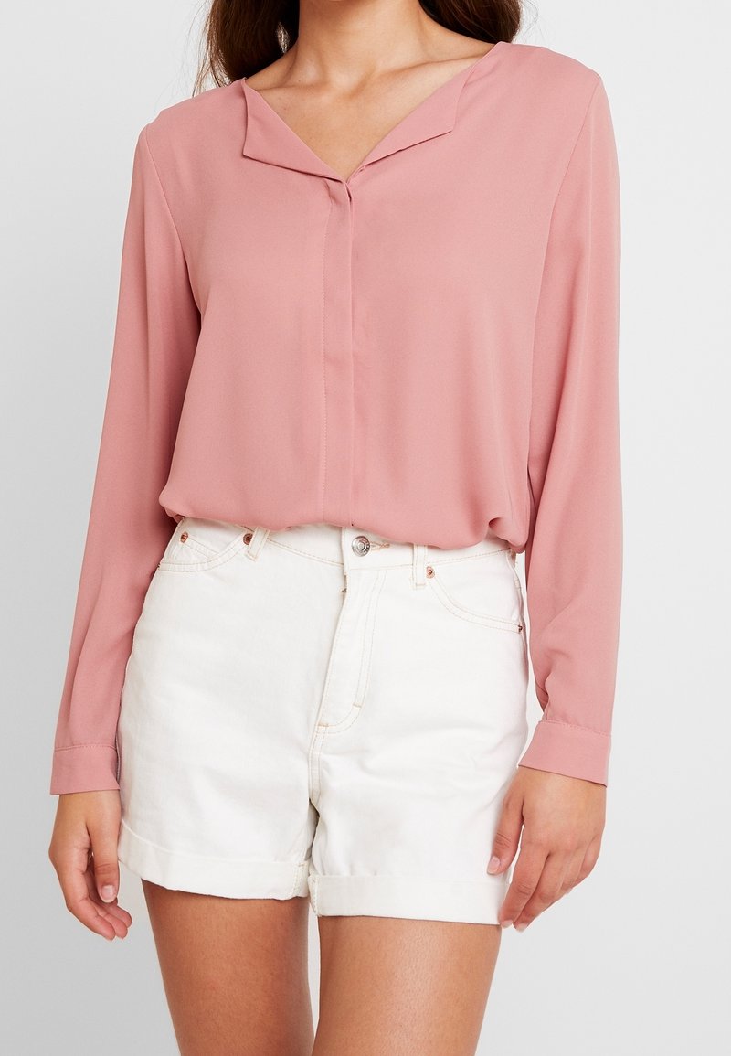 Femme portant un chemisier rose à manches longues rentré dans un short blanc taille haute avec ourlets retroussés, se tenant devant un fond uni.
