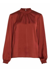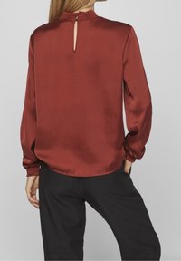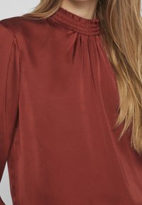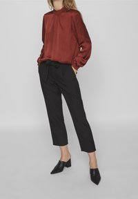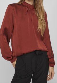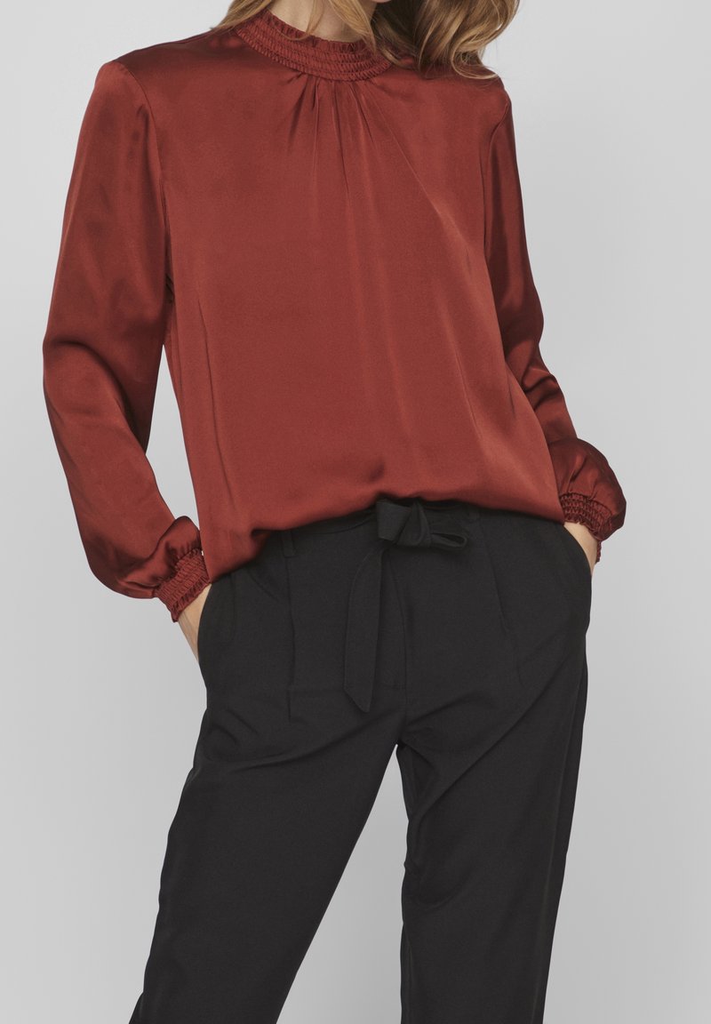 Femme portant un chemisier en satin couleur rouille avec poignets et col smockés, associé à un pantalon noir taille haute noué à la taille.