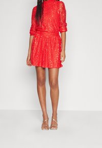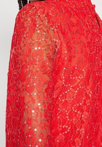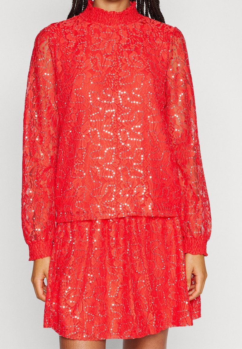 Robe en dentelle rouge avec manches longues bouffantes, col montant à volants et légères décorations en sequins, portée par une personne aux cheveux tressés.