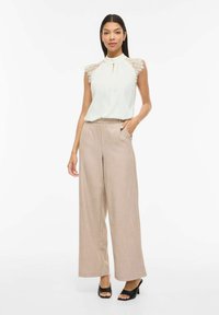 Femme portant un chemisier blanc sans manches avec des épaules en dentelle et un pantalon beige taille haute, debout avec une main dans la poche, souriante.