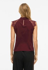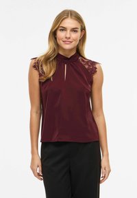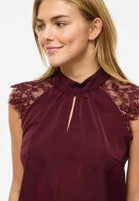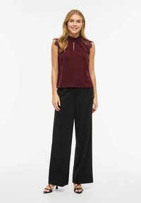 Femme aux longs cheveux blonds portant un chemisier sans manches bordeaux avec des épaules en dentelle et un pantalon noir sur un fond blanc.