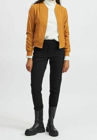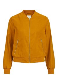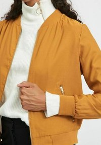 Veste bomber jaune moutarde avec poignets et col côtelés, dotée d'une fermeture éclair et de poches latérales, portée par-dessus un pull blanc côtelé.