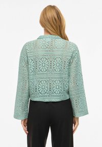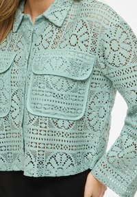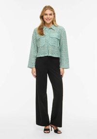 Jeune femme portant une chemise boutonnée en dentelle motif vert menthe avec des poches à rabat à l'avant et un pantalon noir, souriant légèrement, sur fond blanc.