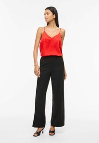 Femme portant un haut rouge sans manches à col en V et un pantalon noir taille haute, debout les mains derrière le dos sur fond blanc.
