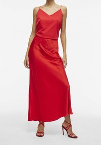 Robe en satin rouge avec un décolleté en V et des bretelles fines, présentant un corsage ajusté qui s'évase légèrement en jupe. Texture lisse.