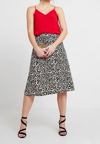 Femme portant un haut sans manches rouge plissé associé à une jupe imprimée léopard noir et blanc.