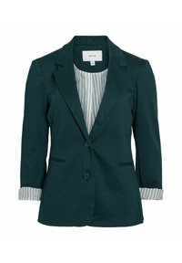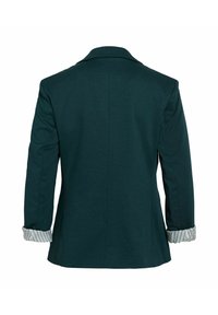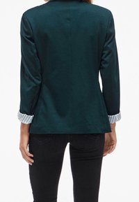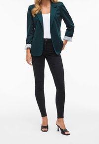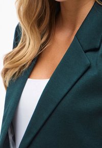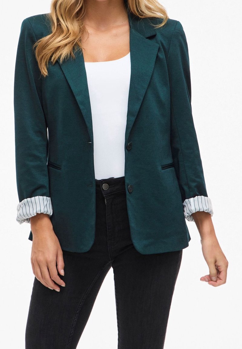 Femme portant un blazer vert foncé aux manches rayées retroussées, un haut blanc ajusté et un pantalon noir taille haute sur fond blanc.