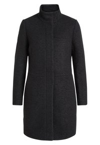 Manteau en mélange de laine noir avec un col montant, des poches latérales et une coupe droite. La surface présente une texture subtile.