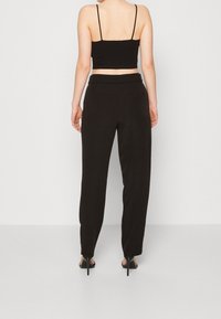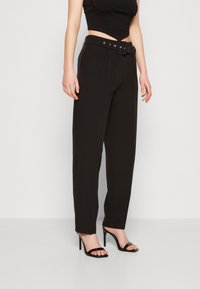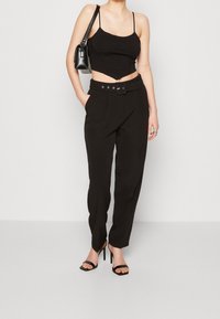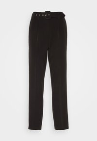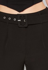 Pantalon noir taille haute à jambes larges, équipé d'une ceinture avec une boucle rectangulaire, porté avec des talons hauts noirs à lanières.