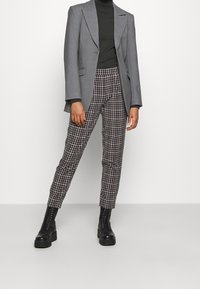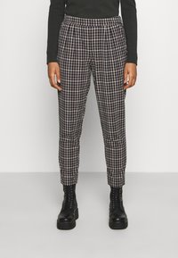 Pantalons à carreaux noir et beige avec une coupe fuselée. Le tissu a une texture lisse. Portés avec des bottines noires à lacets.