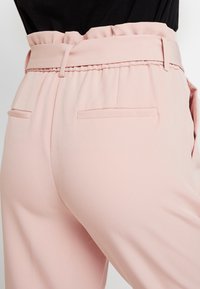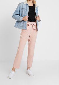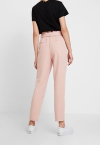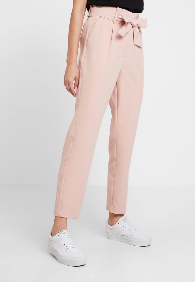 Pantalon rose clair cintré avec détail ceinture et poches latérales, présentant une coupe droite. Associé à des baskets blanches.