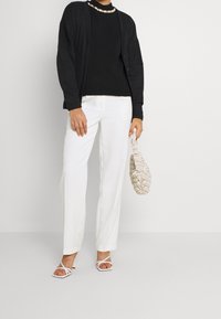 Femme portant un pull noir à manches longues avec des détails en perles et chaîne dorée au niveau du col, et un pantalon blanc, main sur la hanche.