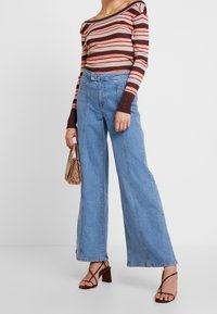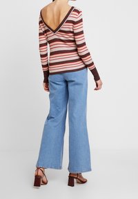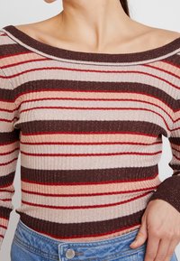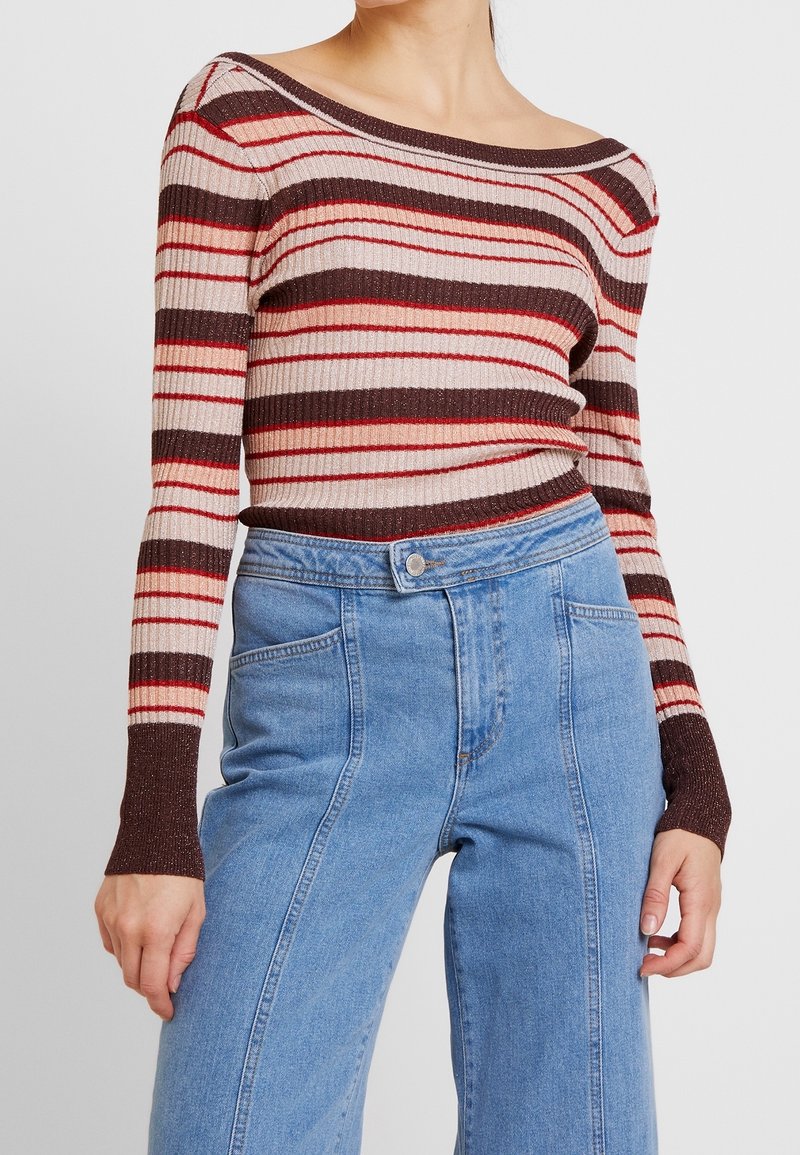 Femme portant un pull moulant à épaules dénudées, côtelé, avec des rayures horizontales marron, beige et rouge, associé à un jean bleu taille haute.