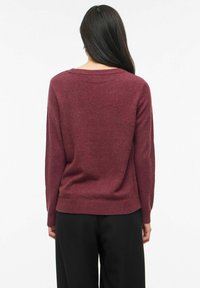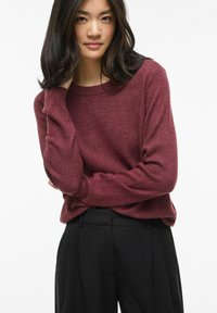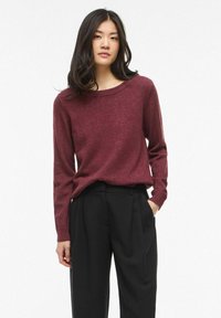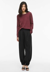Jeune femme aux longs cheveux foncés portant un pull bordeaux à manches longues et un pantalon noir taille haute, debout avec une main dans la poche.