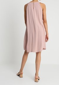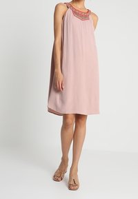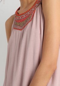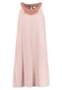 Robe rose sans manches avec un détail de col orné de perles sophistiquées. Tissu fluide, longueur jusqu'aux genoux et coupe décontractée. Texture lisse et forme simple.