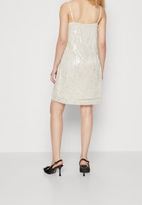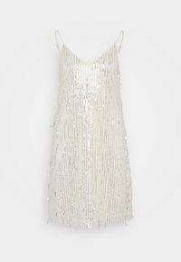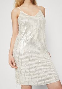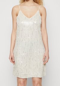 Femme portant une robe blanche sans manches avec des fines bretelles et des rayures verticales en sequins argentés, se tenant contre un fond uni.