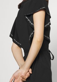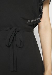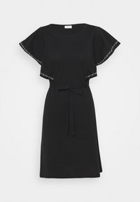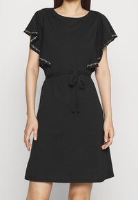 Robe noire avec des manches courtes à volant et un délicat fini. Dispose d'un col rond et d'une ceinture en tissu nouée à la taille. Texture lisse.